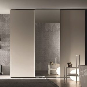 Ντουλάπα με συρόμενες πόρτες βαρέου τύπου σε λάκα ματ με ξύλινα πλαίσια διακοσμητικά