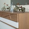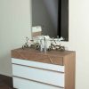 Κρεβάτι από φυσικό καπλαμά ξύλου δρυός, με μασίφ ποδαρικά δρυ, ντυμένη λεπτομέρεια με ύφασμα ή δερμάτινη και φωτιστικά και στις 2 πλευρές. Λεπτομέρεια στα κομοδίνα, τουαλέτα και καθρέπτης από μασίφ ξύλο δρυός.