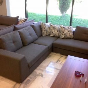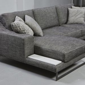 Σαλόνι καναπές γωνία Prive με στρογγυλή πλάτη-μπράτσο και συνδυασμό μετάλλου με ξύλο.